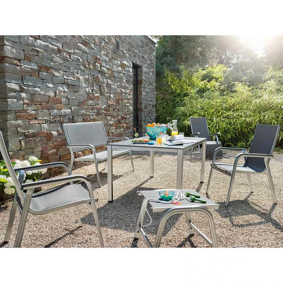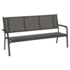 Das Gestell wird aus Aluminium gefertigt. Das geringe Eigengewicht des Materials macht die Gartenbank zu einem robusten, aber dennoch leicht zu transportierenden Sitzmöbel auf Ihrer Terrasse. Für eine attraktive Optik ist das Gestell im Farbton Silber gehalten. Ein weiteres Highlight der Gartenbank ist die Bespannung mit Textilene. Dieser Bezugsstoff überzeugt durch eine hohe Robustheit gegenüber Hitze und Frost und ist leicht zu reinigen. Die Farbgestaltung der Sitzfläche in Anthrazit ist äußerst ansprechend.