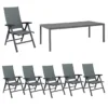 Das Gestell ist aus Aluminium gefertigt. Dadurch lassen sich die Möbel leicht von einem Standort zum nächsten transportieren und sind dennoch sehr stabil. Ein weiterer Pluspunkt der Sitzmöbel ist die Bespannung der Sitzflächen mit Textilene. Dieses Material zeichnet sich durch eine hohe Robustheit gegenüber Hitze und Frost aus und ist leicht zu reinigen. Für die Platte des im Sets enthaltenen Tisches wird mit Keramik beschichtetes Glas verarbeitet. Solche Platten sind stoß-, schlag- und schnittbeständig und zählen somit zu den stabilsten Tischplatten auf dem Gartentisch-Markt. Der Tisch ist klassisch rechteckig gestaltet. Als klassische Design-Komponente fungiert das geradlinige Vierfußgestell. Während die Farbe des Gestells Anthrazit ist, begeistert die Tischplatte in Dunkelgrau.