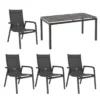 Das Gestell ist aus Aluminium gefertigt. Dadurch lassen sich die Möbel leicht von einem Standort zum nächsten transportieren und sind dennoch sehr stabil. Ein weiterer Pluspunkt der Sitzmöbel ist die Bespannung der Sitzflächen mit Textilene in der Farbe Anthrazit. Dieses Material zeichnet sich durch eine hohe Robustheit gegenüber Hitze und Frost aus und ist leicht zu reinigen. Für die Platte des im Sets enthaltenen Tisches wird mit Keramik beschichtetes Glas verarbeitet. Solche Platten sind stoß-, schlag- und schnittbeständig und zählen somit zu den stabilsten Tischplatten auf dem Gartentisch-Markt. Der Tisch ist klassisch rechteckig gestaltet. Als klassische Design-Komponente fungiert das geradlinige Vierfußgestell. Farblich ist das Gestell in Anthrazit gehalten, die Tischplatte überzeugt in der Farbe Dark Grey.