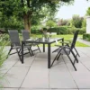 Nur wenig Platz, um das Gartenmöbel-Set im Winter einzulagern? Kein Problem, denn die Gartenstühle sind klappbar und somit kompakt zu verstauen. Darüber hinaus verfügt das Gartenmöbel-Set über eine individuelle Verstellmöglichkeit mittels Rasterschienen. Dadurch bietet es Ihnen immer die ideale Sitzposition – ganz gleich, ob Sie essen, lesen oder einfach entspannen möchten.