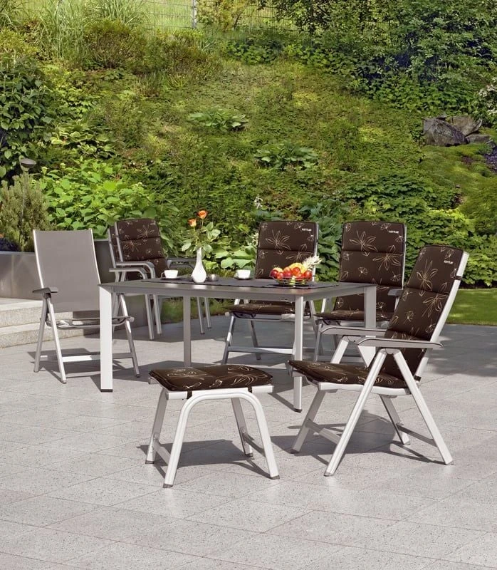 Das Gestell besteht aus pflegeleichtem und wetterfestem Aluminium. Farblich ist dieses in Silber gehalten. Für die Bespannung der Sitzfläche wird hochwertiges Textilene verwendet. Es zeichnet sich durch eine hohe Robustheit gegenüber Hitze und Frost aus und ist leicht zu reinigen. Die Farbgestaltung der Sitzfläche in Anthrazit ist überaus ansprechend.
