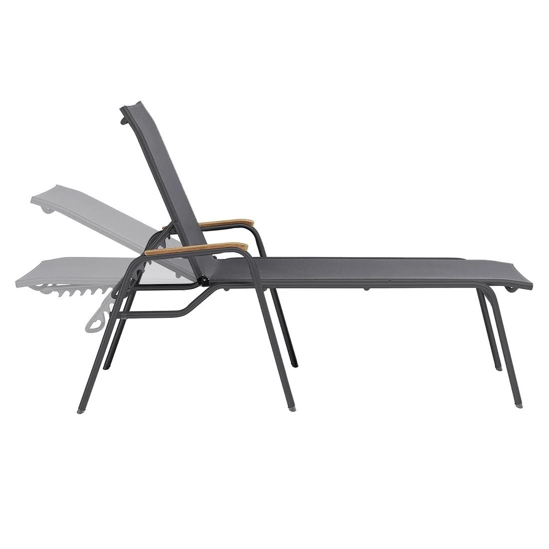 Für die Herstellung des Gestells wird hochwertiges und wetterfestes Aluminium verwendet. Für eine attraktive Optik ist das Gestell im Farbton Anthrazit gehalten. Für die Bespannung der Sitzfläche wird hochwertiges Textilene verwendet. Es zeichnet sich durch eine hohe Robustheit gegenüber Hitze und Frost aus und ist leicht zu reinigen. Die Farbgestaltung der Sitzfläche in Anthrazitgrau ist überaus ansprechend.