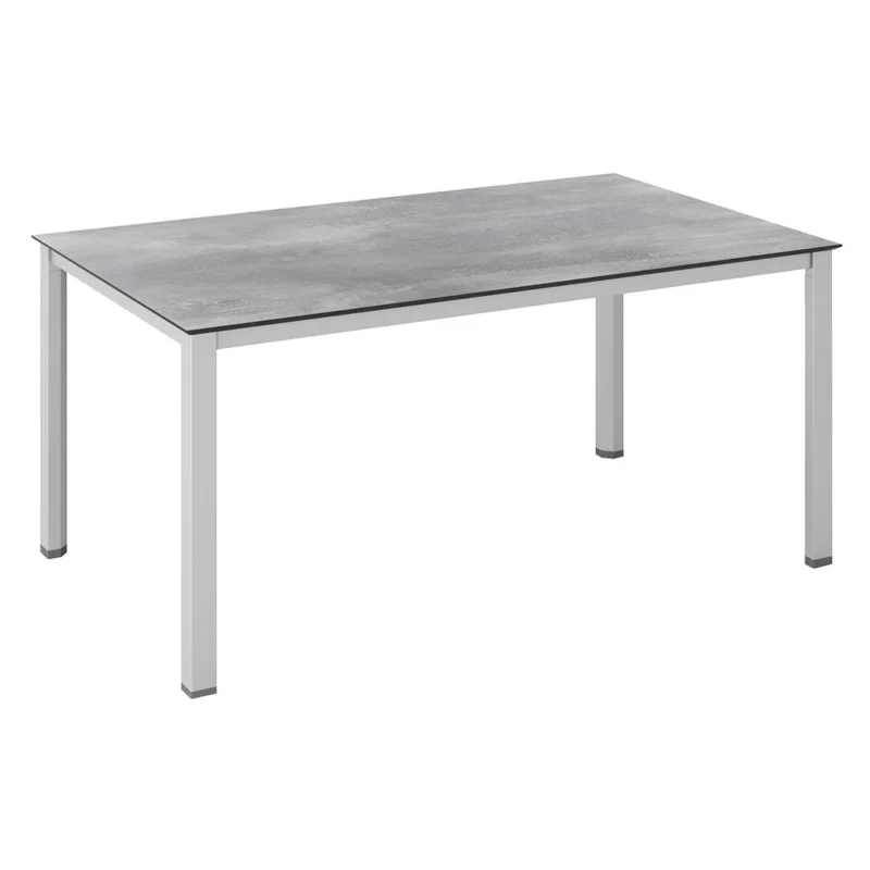 Das Gestell des attraktiven Tisches ist aus Aluminium gefertigt. Klassisch aus vier Tischbeinen besteht das Gestell des Tisches. Eine wunderschöne Optik bietet Ihnen die Tischplatte aus HPL-Kunststoffverbund. Diese im Naturdecor gehaltene Tischplatte ist zudem beständig gegen Frost und Hitze bis maximal 180 °C. Für ein stimmiges Gesamtbild erscheint die Platte in der Farbe Silber-Grau. Das Design des Gartentisches ist klassisch rechteckig gestaltet.