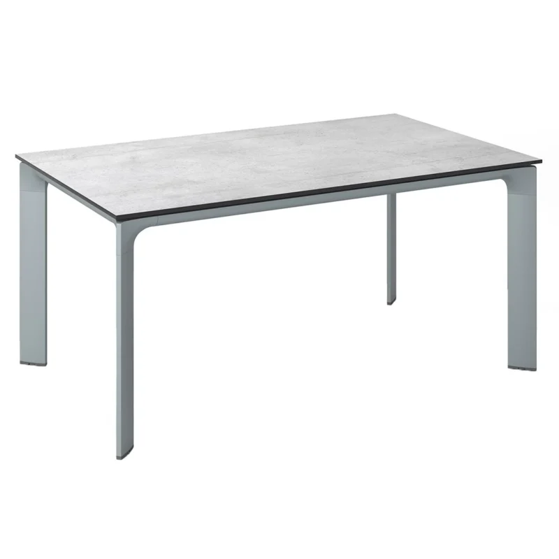 Als Gestellmaterial dient wertiges Aluminium. Klassisch aus vier Tischbeinen besteht das Gestell des Tisches. Die formschöne HPL-Tischplatte ist nicht nur ein optischer Hingucker, sondern besitzt auch eine enorm robuste und absolut kratzfeste Oberfläche, die unterschiedlichen Belastungen trotzt. Für ein stimmiges Gesamtbild erscheint die Platte in der Farbe Grau. Die Form des Gartentisches ist klassisch rechteckig gehalten.