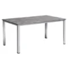 Das Gestell des attraktiven Tisches besteht aus Aluminium. Klassisch aus vier Tischbeinen besteht das Gestell des Tisches. Für die Tischplatte wird mit Keramik beschichtetes Glas verwendet. Solche Platten sind stoß-, schlag- und schnittbeständig und zählen somit zu den stabilsten Tischplatten auf dem Gartentisch-Markt. Für ein stimmiges Gesamtbild erscheint die Platte in der Farbe Fossil Natur. Die rechteckige Form ermöglicht es Ihnen, den Gartentisch in Ecken und an Häuserwänden platzsparend einzusetzen.