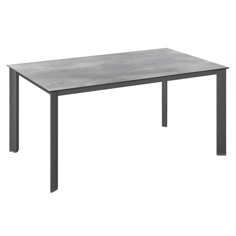 Das Gestell des eleganten Tisches besteht aus Aluminium. Optisch ist das Gestell in Anthrazit gehalten. Eine ausgesprochen schöne Optik bietet Ihnen die Tischplatte aus HPL-Kunststoffverbund. Diese natürlich gehaltene Tischplatte ist zusätzlich frostsicher und hitzebeständig bis maximal 180 °C. Farblich ist die Tischplatte in einem schönen Silbergrau gehalten. Als klassische Design-Komponente fungiert das geradlinige Vierfußgestell. Mit der rechteckigen Form lässt sich der Gartentisch platzsparend in Ecken oder an Häuserwänden aufstellen.