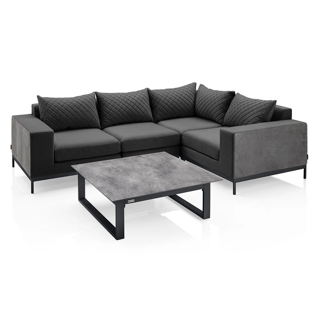 Das Gestell ist aus Aluminium hergestellt. Optisch begeistert das Gestell in der Farbe Anthrazit. Die hohe Witterungsbeständigkeit erfährt das Möbelstück auch durch die hochwertigen Bezüge aus dem Markenstoff Sunbrella. Dieser ist u.a. wasser- und schmutzabweisend, UV-beständig und schimmelresistent – ideale Voraussetzungen für eine gepolsterte Lounge im Freien. Die Farbe des Bezugs ist Sooty.