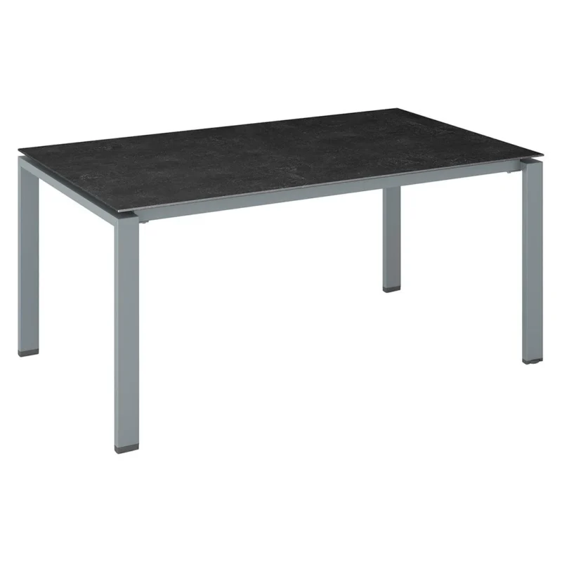 Als Gestellmaterial dient wertiges Aluminium. Optisch ist das Gestell in Silber gehalten. Die Tischplatte besteht aus Dekton. Dekton ist eine Mischung aus 20 natürlichen Mineralien. Bei der Herstellung von Dekton kommt eine besondere Technologie zum Einsatz, die in der Lage ist, mineralische Partikel so zu sintern, dass sie sich miteinander verbinden. Das Ergebnis: eine langlebige, sehr robuste und für jeden Einsatzbereich geeignete Tischplatte. Farblich ist die Tischplatte in einem schönen Fossil Natur gehalten. Klassisch aus vier Tischbeinen besteht das Gestell des Tisches. Die rechteckige Form ermöglicht es Ihnen, den Gartentisch in Ecken und an Häuserwänden platzsparend einzusetzen.
