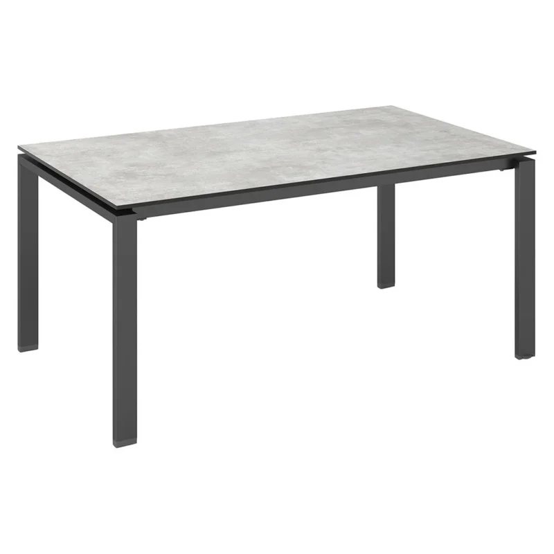 Das Gestell des eleganten Tisches ist aus Aluminium gefertigt. Farblich ist das Gestell in Anthrazit gehalten. Die formvollendete HPL-Tischplatte ist nicht nur ein optischer Hingucker, sondern besitzt außerdem eine sehr massive und durchaus kratzfeste Oberfläche, die einer Vielzahl von Belastungen trotzt. Für ein stimmiges Gesamtbild erscheint die Platte in der Farbe Hellgrau Meliert. Als klassische Design-Komponente fungiert das geradlinige Vierfußgestell. Die rechteckige Form ermöglicht es Ihnen, den Gartentisch in Ecken und an Häuserwänden platzsparend einzusetzen.
