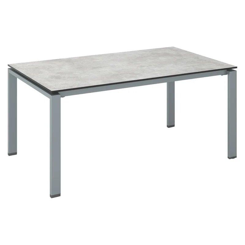 Das Gestell des eleganten Tisches ist aus Aluminium gefertigt. Optisch ist das Gestell in Silber gehalten. Die edle HPL-Tischplatte ist nicht nur ein optischer Hingucker, sondern besitzt außerdem eine enorm massive und durchaus kratzfeste Oberfläche, die sämtlichen Belastungen standhält. Für ein stimmiges Gesamtbild erscheint die Platte in der Farbe Hellgrau Meliert. Als klassische Design-Komponente fungiert das geradlinige Vierfußgestell. Mit der rechteckigen Form lässt sich der Gartentisch platzsparend in Ecken oder an Häuserwänden aufstellen.