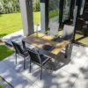 Damit das Gartenmöbel-Set optisch ansprechend ist, sind das Gestell und die Sitzfläche im Farbton Anthrazit gehalten. Das Gestell ist aus Aluminium gefertigt. Dadurch lassen sich die Möbel leicht von einem Standort zum nächsten transportieren und sind dennoch sehr stabil. Ein ist die Bespannung der Sitzflächen mit Textilene. Dieses Material zeichnet sich durch eine hohe Robustheit gegenüber Hitze und Frost aus und ist leicht zu reinigen. Das Set beinhaltet auch einen Tisch. Das Material, das für die Tischplatte verwendet wird, heißt „Vivodur“. Dabei handelt es sich um eine mit Melamin beschichtete Spanplatte. Durch die Beschichtung ist die Platte wetter- und kälteresistent sowie schlagfest und damit die perfekte Outdoor-Tischplatte. Farblich überzeugt die Tischplatte in Schiefer. Mit der rechteckigen Form lässt sich der Tisch platzsparend in Ecken oder an Häuserwänden aufstellen.